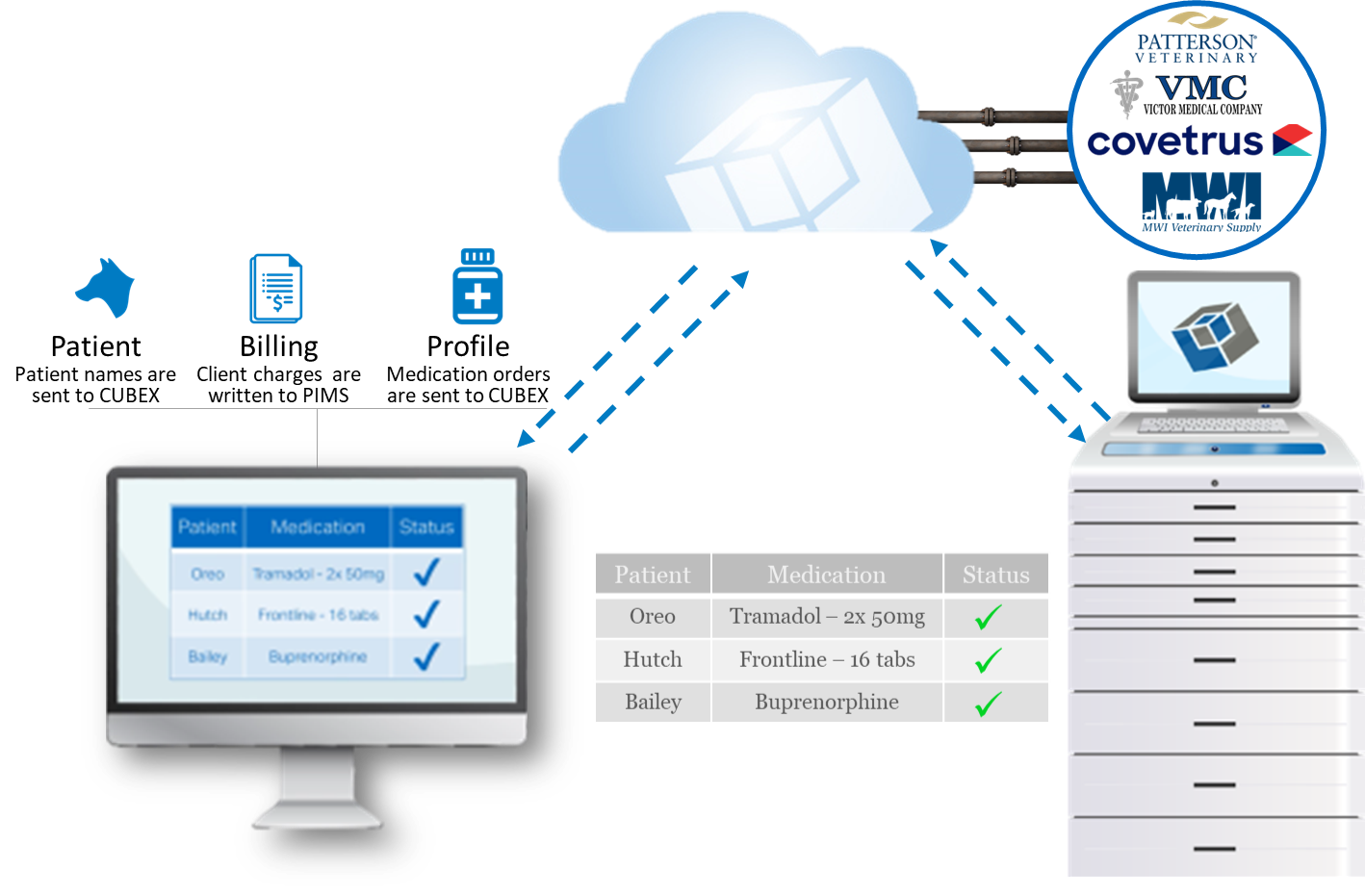 When a Practice Management System (PMS) checks in a patient, the patient will automatically send over to myCubex and activate the patient at the inventory device. When the patient checks out or when invoicing is initiated in the PMS, the patient will deactivate at the cabinet.