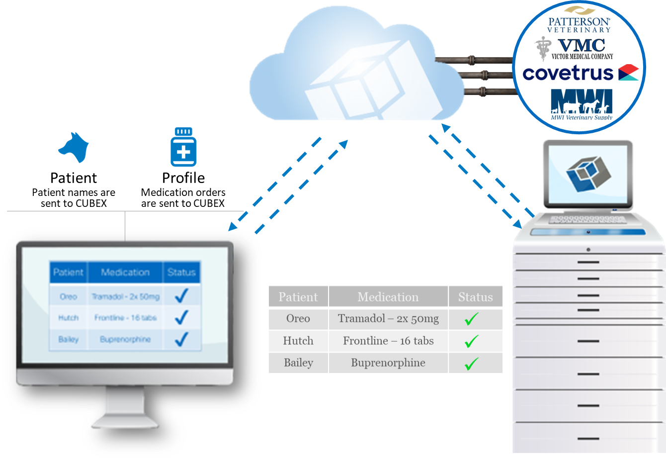 When a Practice Management System (PMS) checks in a patient, the patient will automatically send over to myCubex and activate the patient at the inventory device. When the patient checks out or when invoicing is initiated in the PMS, the patient will deactivate at the cabinet.